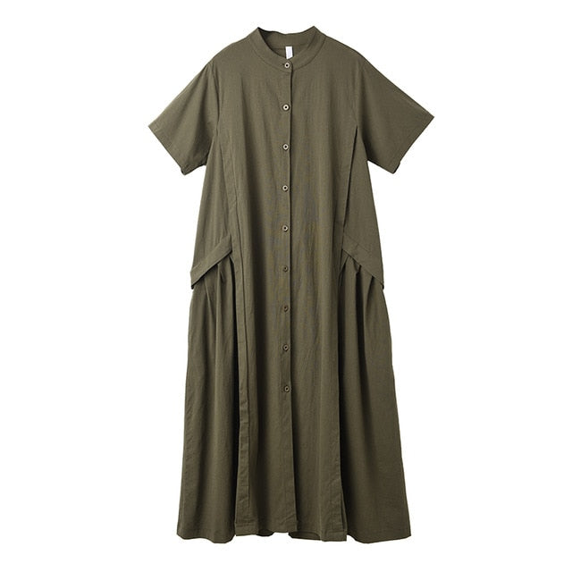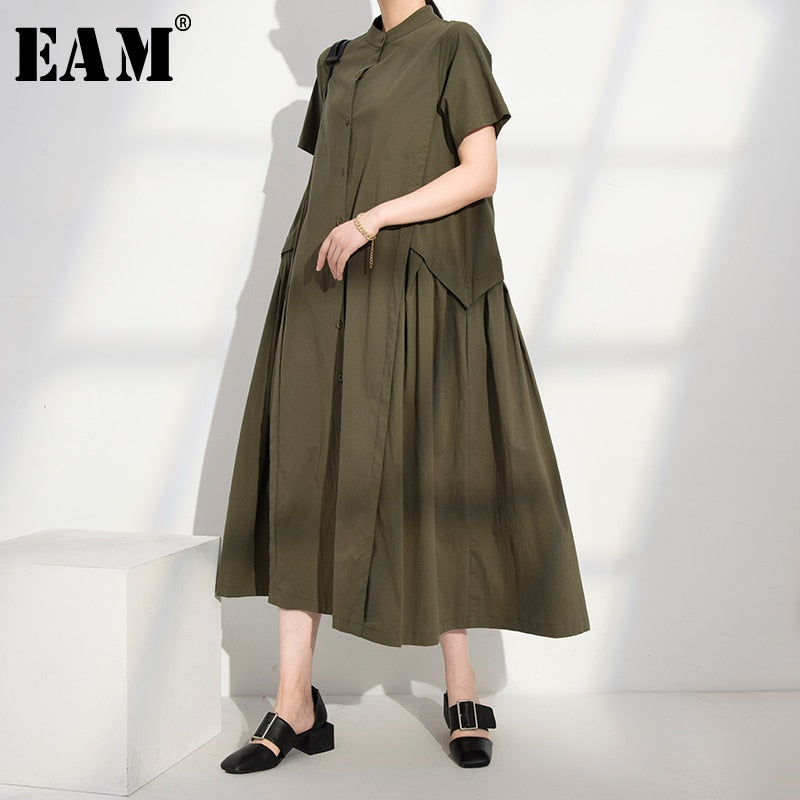 Brand Name: EAMMaterial: COTTONMaterial: PolyesterSilhouette: LooseSeason: SummerNeckline: StandSleeve Length(cm): ShortSleeve Style: REGULARDecoration: NONEStyle: CasualWaistline: NaturalPattern Type: SolidDresses Length: Mid-Calfitem number: 1W09101color: black greenSeason: Spring Summer