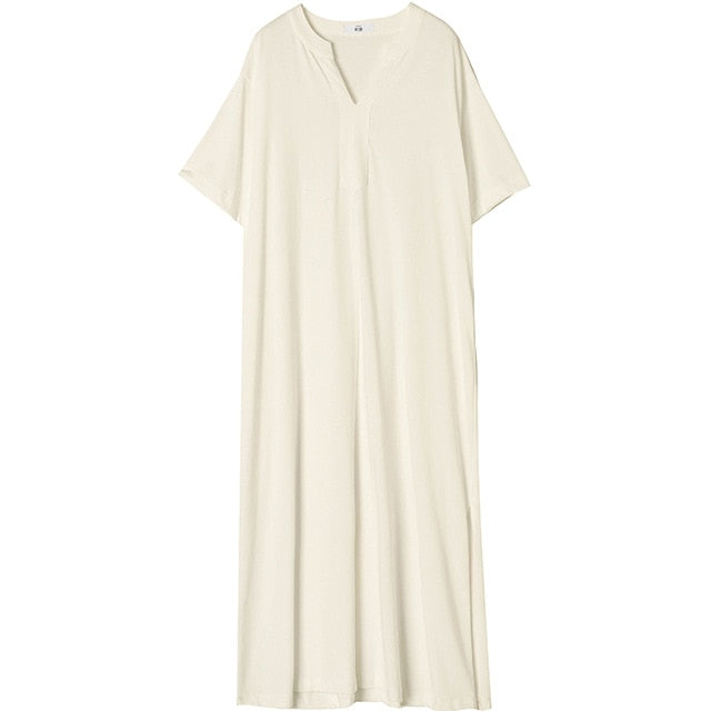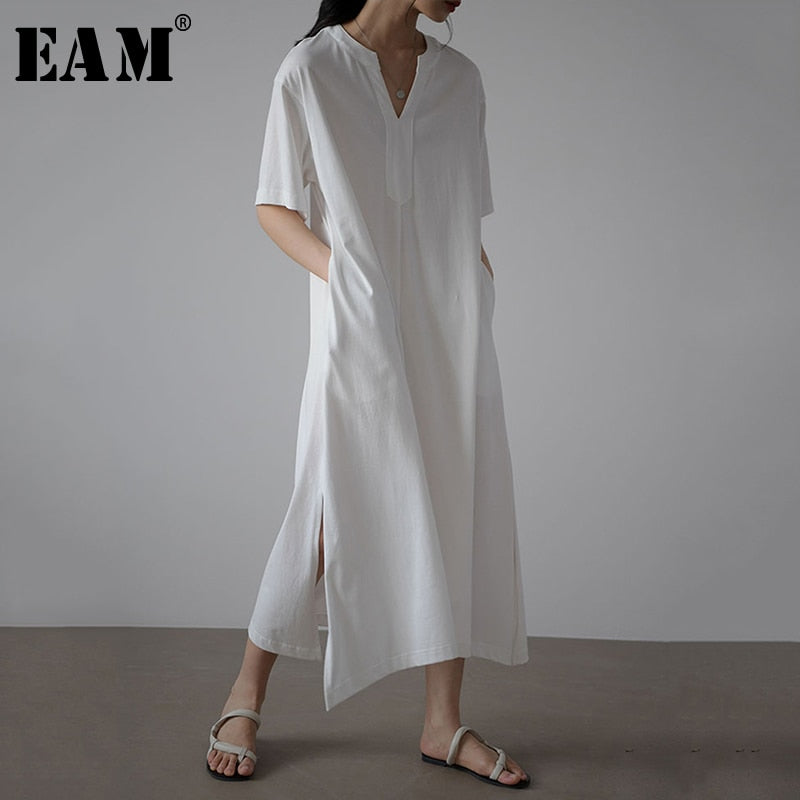 Brand Name: EAMMaterial: COTTONMaterial: PolyesterSilhouette: LooseSeason: SummerNeckline: V-NeckSleeve Length(cm): HalfSleeve Style: REGULARDecoration: NONEStyle: CasualWaistline: NaturalPattern Type: SolidDresses Length: Mid-Calfitem number: 1X60600color: whiteSeason: Spring Summer